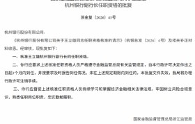 2月25日金融一线消息,国家金融监督管理总局浙江监管局发布批复,核准王立雄杭州银行副行长的任职资...