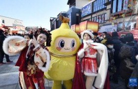 2月18日,在北京隆福寺新春市集上,演员向游客拜年。大年初二,市民游客来到北京隆福寺新春市集、后海景...