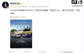 华为余承东:鸿蒙智行问界 M6 SUV 24 小时订单突破 6 万台