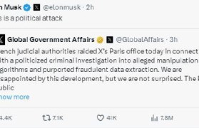 当地时间周二,法国巴黎检方表示,已对美国企业家马斯克旗下社交媒体平台X在巴黎的办公场所展开搜查。...