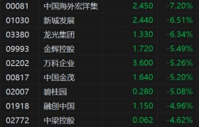 港股内房股全线下跌,旭辉控股集团跌近10%,世茂集团、中国海外宏洋集跌超7%,新城发展、龙光集团跌超...