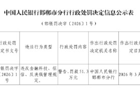 3月23日金融一线消息,中国人民银行邯郸市分行行政处罚信息公开表显示,邯郸市城区农村信用合作联社...
