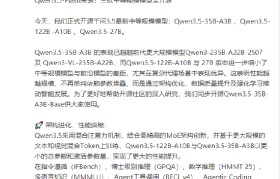 2月25日消息,据千问大模型官方微博,今天,千问大模型正式开源千问3.5最新中等规模模型:Qwe...