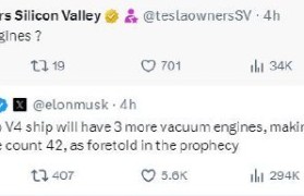马斯克在X平台上回复“特斯拉硅谷车主俱乐部”询问时表示:“星舰V4将增加3台真空发动机,使全栈发...
