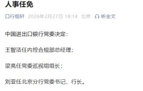 2月27日金融一线消息,据“口行组轩”微信公众号,中国进出口银行党委决定:王智洁任内控合规部总经...