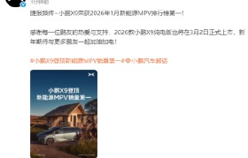 小鹏汽车官方微博今日宣布,小鹏X9荣获2026年1月新能源MPV排行榜第一。 据悉,2026...