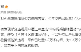 抖音黑板报今日发文称,近期,平台发现部分违规用户通过AI生成“单亲妈妈暧昧互动”“美女魅惑舞蹈”...