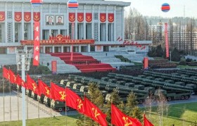 当地时间18日,朝鲜军工部门工人阶级献给朝鲜劳动党第九次代表大会的600毫米大口径火箭炮赠送仪式...