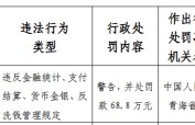 青海湟源农村商业银行被罚68.8万元:违反金融统计、支付结算、货币金银、反洗钱管理规定