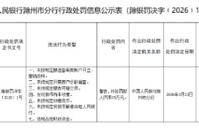 3月27日金融一线消息,中国人民银行滁州市分行行政处罚信息公示表显示,滁州皖东农村商业银行股份有...