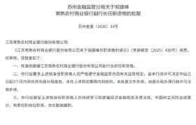 3月20日金融一线消息,苏州金融监管分局发布关于倪建峰常熟农村商业银行副行长任职资格的批复,核准...