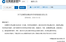 3月4日金融一线消息,建设银行近日发布公告称,近期国内外贵金属价格波动进一步加剧,市场风险显著提...