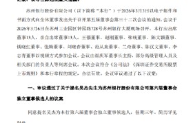 3月6日金融一线消息,苏州银行发布公告称,第五届董事会第三十二次会议审议通过了关于提名吴杰先生为...