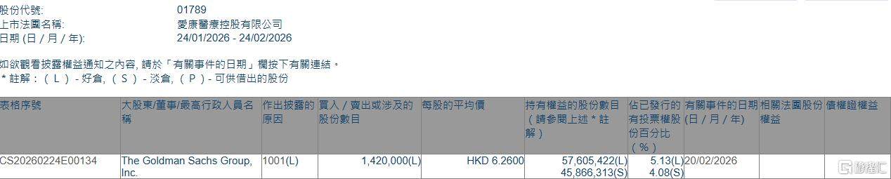 格隆汇2月24日丨根据联交所最新权益披露资料显示,2026年2月20日,爱康医疗(01789.HK)获The Goldman Sachs Group, Inc.以每股均价6.26港元增持好仓142万股,涉资约888.92万港元。