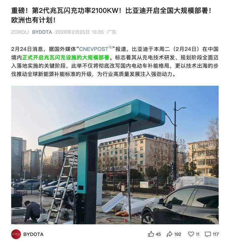 凤凰网科技讯 2月25日,“BYDOTA”援引国外媒体“CNEVPOST”消息称,比亚迪于2月24日在中国境内正式开启兆瓦闪充设施的大规模部署。