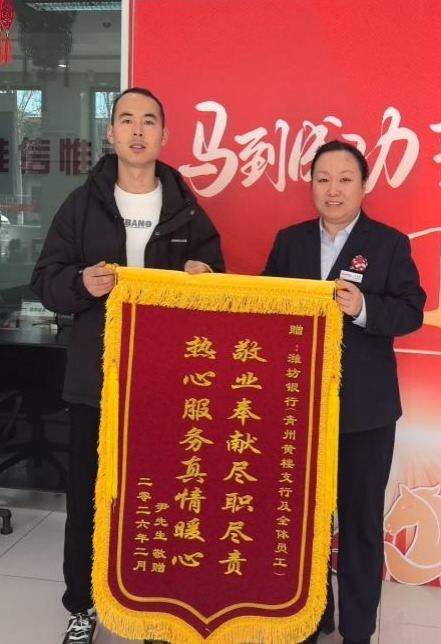 潍坊银行青州管辖行黄楼支行的员工用实际行动诠释雷锋精神。外地客户尹先生不慎遗落一万元现金,支行员工发现后主动联系并延时等待其从外地返回领取。客户尹先生深受感动,专程送来印有“敬业奉献尽职尽责 热情服务真情暖心”的锦旗致谢。这一暖心举动不仅展现了潍坊银行员工的职业操守,更传递了金融服务的温度与善意。