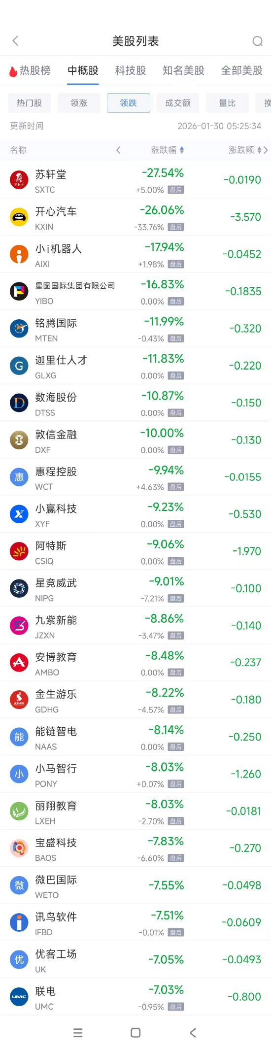 领跌中概股列表: