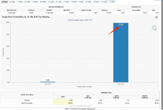 市场主流预期认为,美联储将维持3.5%至3.75%的联邦基金利率不变。据CME“美联储观察”:美联储维持利率不变的概率为99.2%,降息25个基点的概率仅为0.8%,几乎可以肯定美联储在本次决议上不会降息。