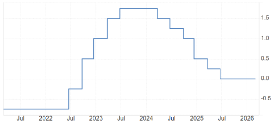 2024年3月份至今,瑞士央行持续降息,基准利率从1.75%降至目前的0%,也就是零利率.零利率状态已经持续了将近10个月,但瑞士的核心通胀率并没有反弹迹象。如果今年下半年瑞士进入通货紧缩状态,不排除瑞士央行会选择极端的负利率政策。