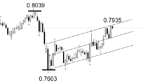 行情方面,USDCHF中短期走势偏多头,目前市价运行于图中上升通道内部,市价接近通道上轨,如果今日收阴线,短线遇阻回落概率较高。中期高点为0.8039,高于最新上涨波段的最高点0.7935点,阻力作用仍然有效。中期低点为0.7603,距离市价较远,参考意义不大。