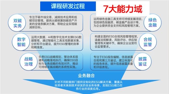 从研发依据看,该证书对应的人才模型将ESG人才划分为执行应用、技术分析、战略管理三大层次,并进一步提炼出双碳实务、数字智能、战略治理、披露鉴证、合规监管、绿色金融、业务融合七大核心能力域,覆盖150个关键技能项,形成较完整的能力矩阵。
