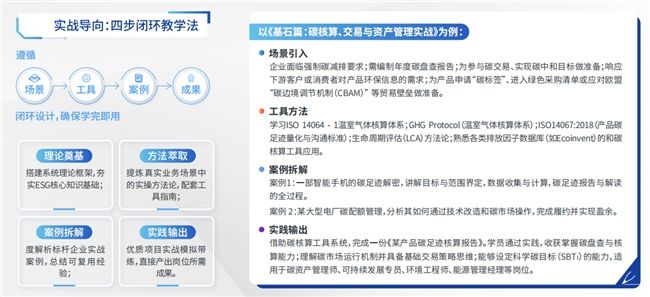 以碳管理场景为例,学习者不仅要理解ISO 14064-1、GHG Protocol、ISO 14067、LCA等方法体系,还要能够结合实际业务完成碳盘查、产品碳足迹核算、碳配额管理和碳资产管理等任务;