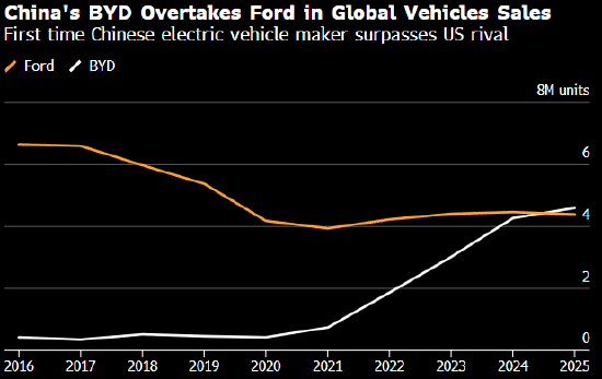 福特汽车公司去年的全球汽车销量首次输给了比亚迪,后面这家中国公司在全球最大汽车制造商中的排名继续攀升。