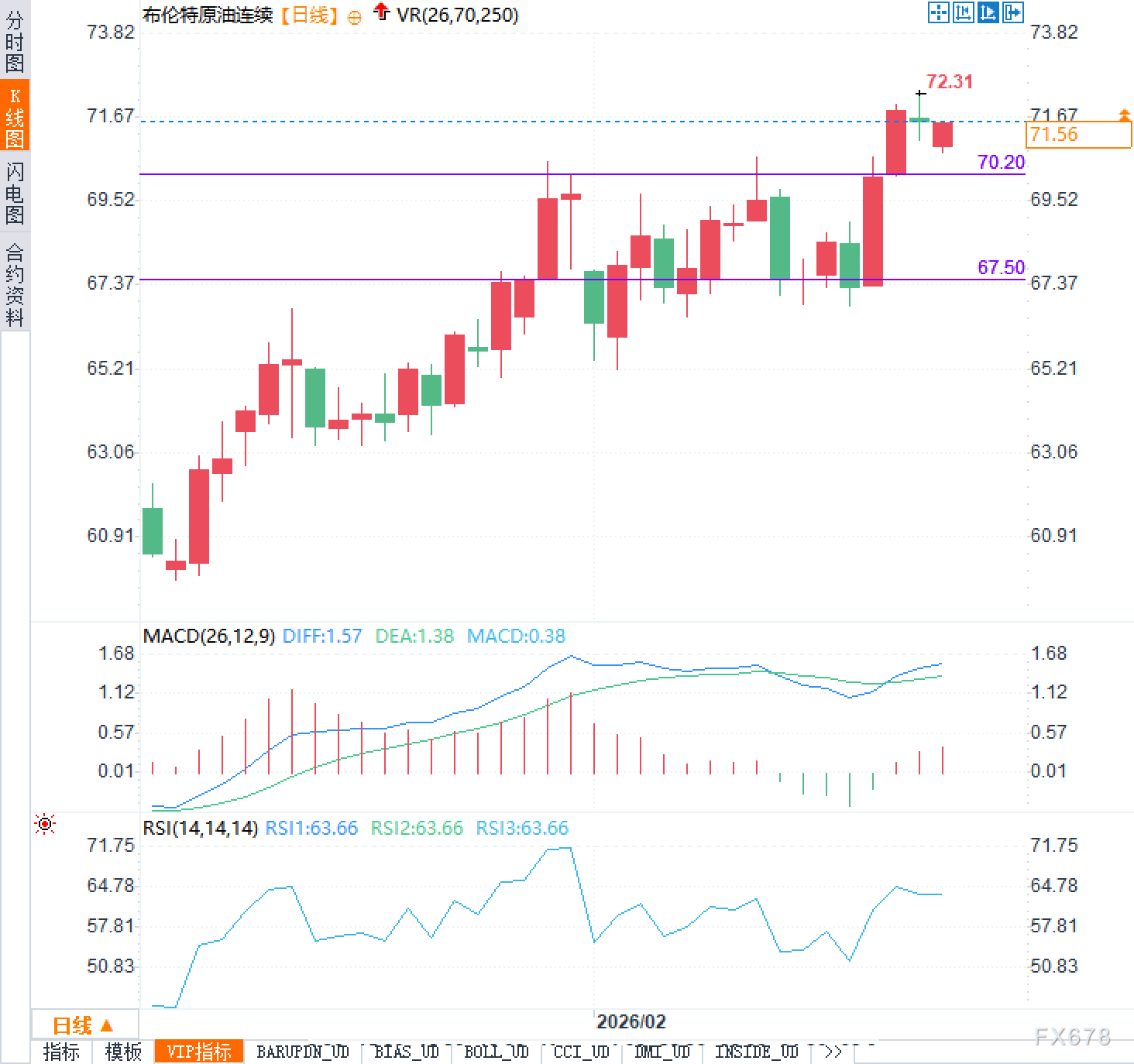 技术面上,日线图显示价格正处于前期抬升后的高位整理区间。上方72.31美元附近构成了阶段性强压,若要有效突破,往往需要新的强刺激来进一步抬升风险溢价或吸引趋势资金跟进。下方则需重点关注70.20美元一带的回撤承接力度,而更关键的支撑位于67.50美元附近,该位置更接近此前震荡区的中枢,一旦失守,市场可能会重新评估当前的溢价水平是否过高。指标方面,MACD参数显示DIFF为1.57,DEA为1.38,MACD为0.38,虽属多头结构但动能并非极端强势,更像是上涨后的高位修复;RSI为63.66,处于偏强但未到过热的区间,符合“强势震荡”而非“单边加速”的状态。综合来看,布伦特原油当前更像是在用时间换空间,等待美伊周四会谈结果这一终极变量的揭晓。