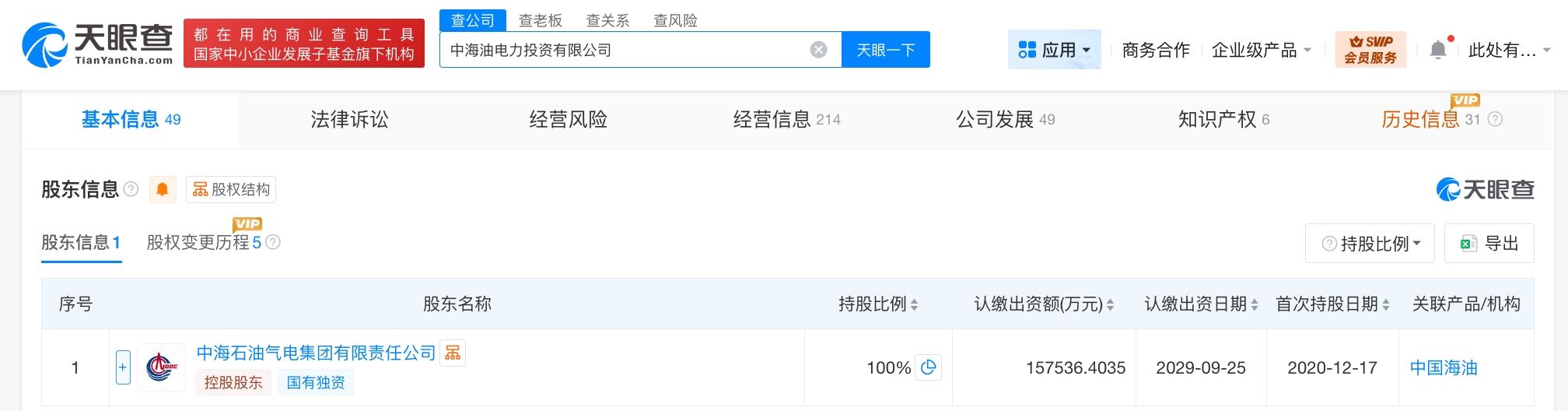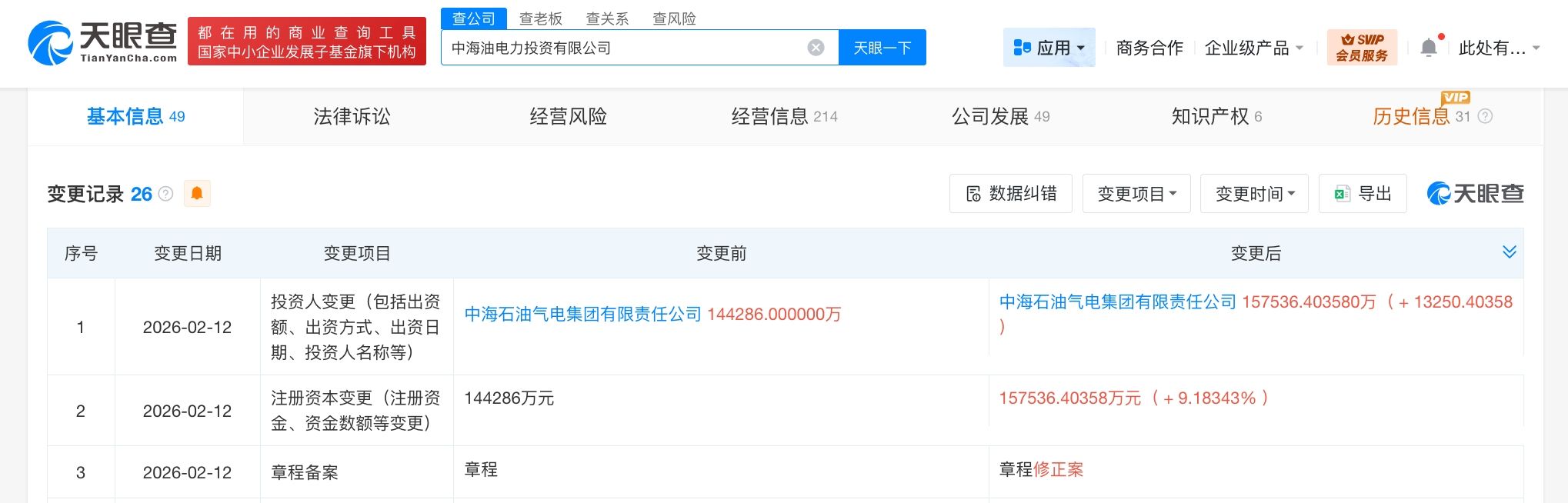 天眼查App显示,近日,中海油电力投资有限公司发生工商变更,注册资本由约14.4亿人民币增至约15.8亿人民币,增幅约9%。