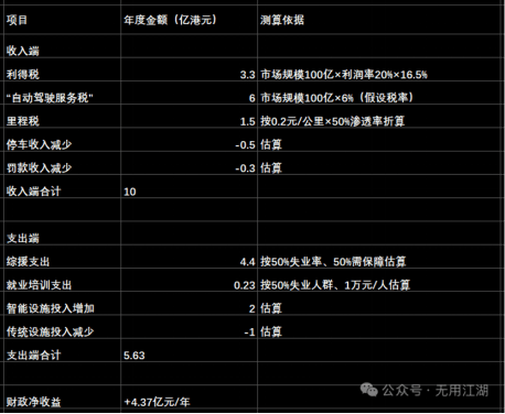 如果我们暂时搁置关于监管、就业冲击的常规讨论,仅从香港特区政府的财政收入与支出维度进行宏观测算,会得出一个清晰的结论:Robotaxi大规模普及的临界点一旦到来,不仅将提升出行服务的供给稳定性,更将为香港财政带来显著的净收益。而这一方向,与最新预算案“投资未来”的理念高度一致。
