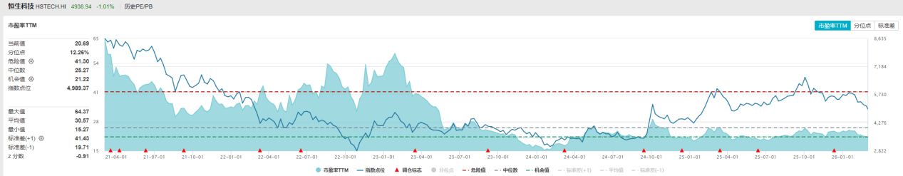 从估值看,恒生科技指数目前的PE-TTM已回落至近5年12.26%分位数。这个位置意味着市场现在对这批中国核心科技资产的定价,已经包含了极其悲观的预期。无论是对美联储鹰派政策的担忧,还是对AI投入回报周期的质疑,抑或是对平台经济监管环境的情绪扰动,基本上都已经被计入价格。