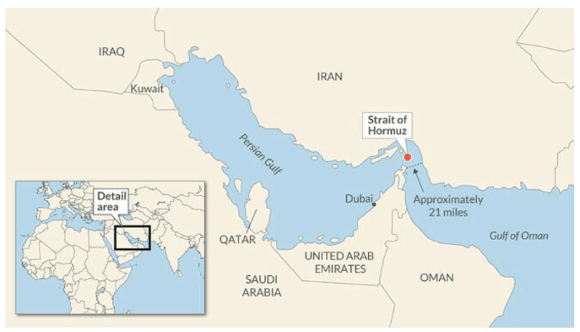 霍尔木兹海峡是波斯湾通往印度洋的唯一海道。该海峡东西长150千米,南北宽64-97千米,最窄处仅48.3千米,它连接波斯湾、阿曼湾和阿拉伯海,并进一步通往印度洋。虽然霍尔木兹海峡并不宽敞,却承担近三分之一的全球海运原油和五分之一的液化天然气运输。