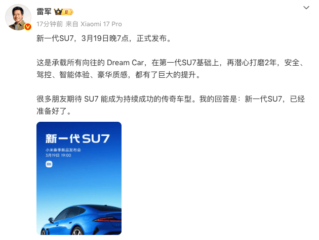 小米集团CEO雷军:新一代SU7 3月19日晚7点正式发布!还有Xiaomi Book Pro14,Xiaomi Watch S5
