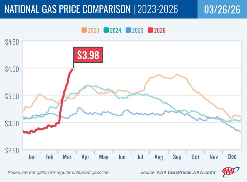美国汽车协会3月26日最新数据显示,美国汽油均价单周涨幅达10美分,单月涨幅更是高达1美元,每加仑汽油价格从2月26日的2.98美元,短短一个月飙升至3.98美元。随着伊朗相关地缘冲突持续,国际原油价格居高不下,美国汽油均价恐将触及每加仑4美元,将是自2022年8月以来首次。随着春假季持续,汽油需求亦在攀升,这也是加油站油价上涨的另一因素。