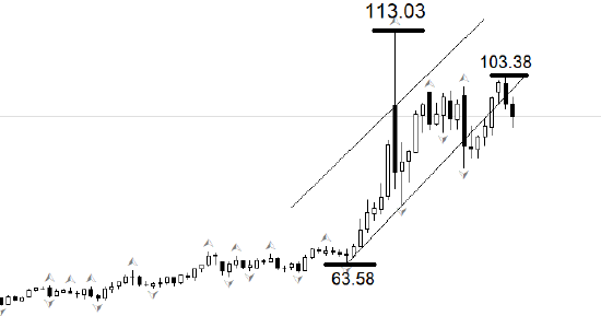 行情走势方面,日线级别,自从3月16日以来,美原油一直保持横盘震荡状态,虽然屡次突破100美元整数关口,但是无法有效扩大涨幅。本周二最高触及103.38美元,随后连跌两日,最新价已经处于上升通道下轨之外。如果本周没有出现大幅度反弹,收盘价一直处于通道线下方,可能意味着美原油的涨势结束。一旦美伊冲突显现缓和迹象,美原油可能迎来剧烈下跌。