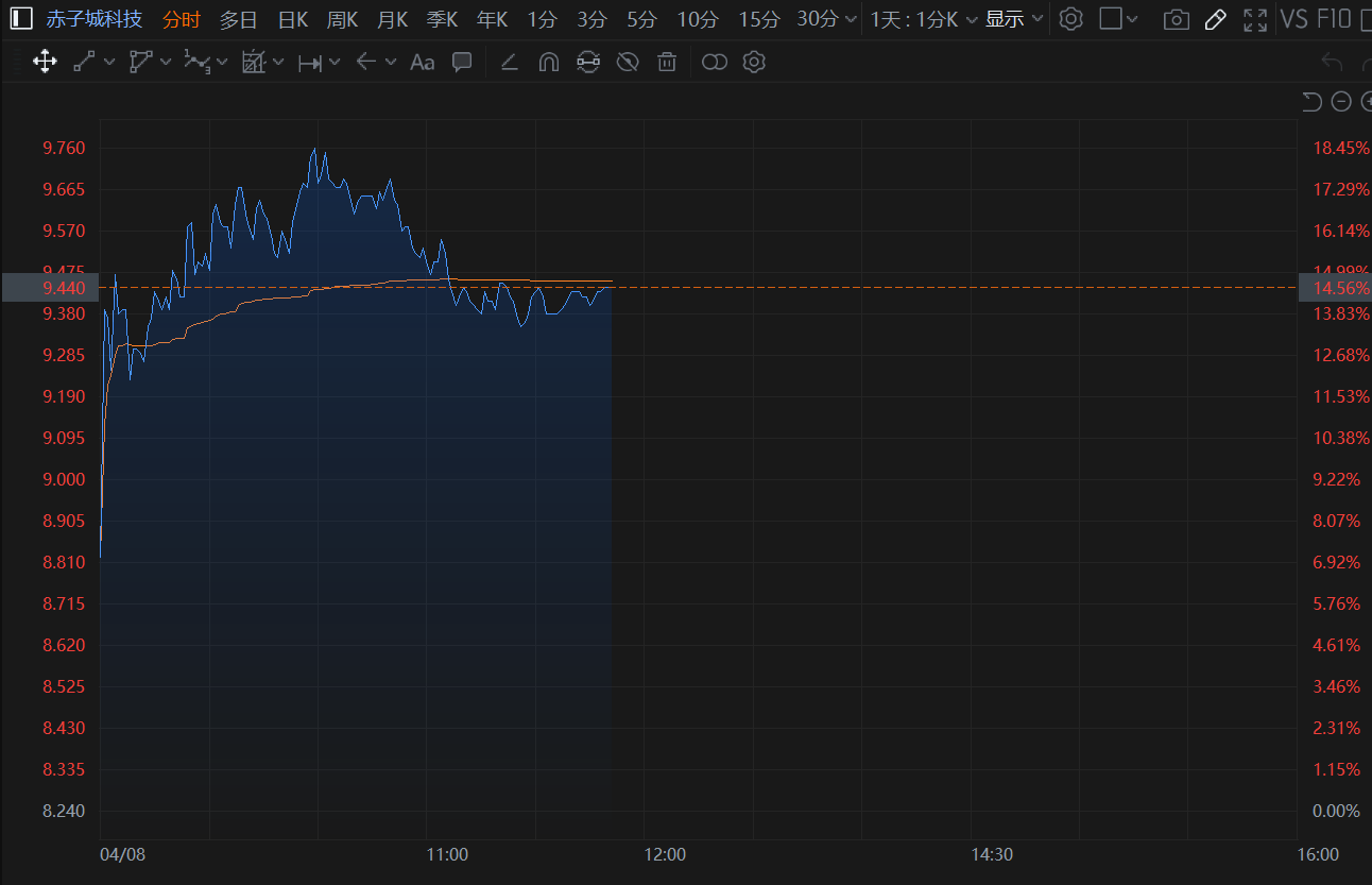 今日早盘,港股赤子城科技强势拉升,盘中最高触及9.76港元,涨幅一度达18.45%,上午收盘涨幅超14%,成交额2.8亿港元。