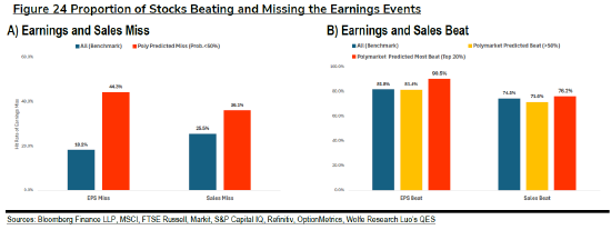 Wolfe Research的一份报告显示,当Polymarket用户押注某公司盈利表现可能不及预期时,这一押注应验的概率为44%,是历史基准水平18%的两倍多。而当押注者非常看好某公司盈利将超出预期时,这种情况发生的概率高达90%,高于81%的常规水平。