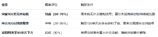 若本周末没有美方或伊方释放的缓和信号,油轮扣押事件导致更多报复行动,则下周一开盘油价可能跳空突破100美元。若出现意外的外交接触迹象(如第三国斡旋取得进展),或伊朗释放愿意谈判的暗示,则油价可能回吐近期大部分涨幅,重新测试92-94美元区域。