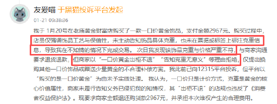 1月黑猫投诉服饰领域红黑榜:老庙黄金隐瞒克重拒绝退货