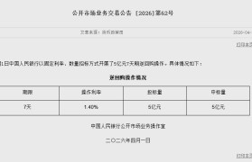 4月1日金融一线消息,2026年4月1日中国人民银行以固定利率、数量招标方式开展了5亿元7天期逆...
