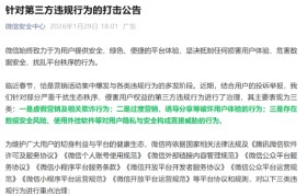 1月29日,微信安全中心官微发布《针对第三方违规行为的打击公告》。《公告》表示,临近春节,结合用...