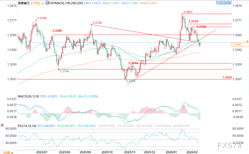 从下行风险来看,如果价格持续跌破1.3430支撑位,那么1.3330这一关键水平就会被触及,该水平与11月至1月上涨行情的0.618斐波那契回撤比例相吻合,具备较强的技术支撑意义,若该位置失守,将进一步强化短期下行趋势。倘若价格继续向下跌破1.33关口,那么向1.30心理支撑区运行的可能性将显著增加,而这种下行走势大概率会伴随着整体美元指数(DXY)的走强,美元的避险买盘或政策预期支撑,将进一步压制英镑兑美元的走势。