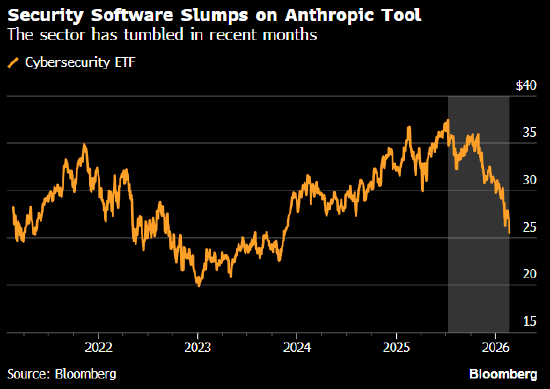 网络安全股的下跌是AI竞争担忧引发的软件股抛售的又一例证。这种焦虑情绪已持续数周,iShares 扩展科技-软件部门ETF今年以来已下跌超过 23%,势将创下2008年金融危机以来最大的季度跌幅。