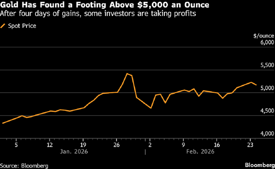 随着投资者寻求避险,黄金在月初经历历史性暴跌后,重新站稳每盎司5000美元关口。此前一波投机性买盘曾将多年涨势推向临界点,导致金价从1月下旬高于5595美元的历史高位大幅回落。目前金价已收复超过一半跌幅,但交易走势异常震荡。
