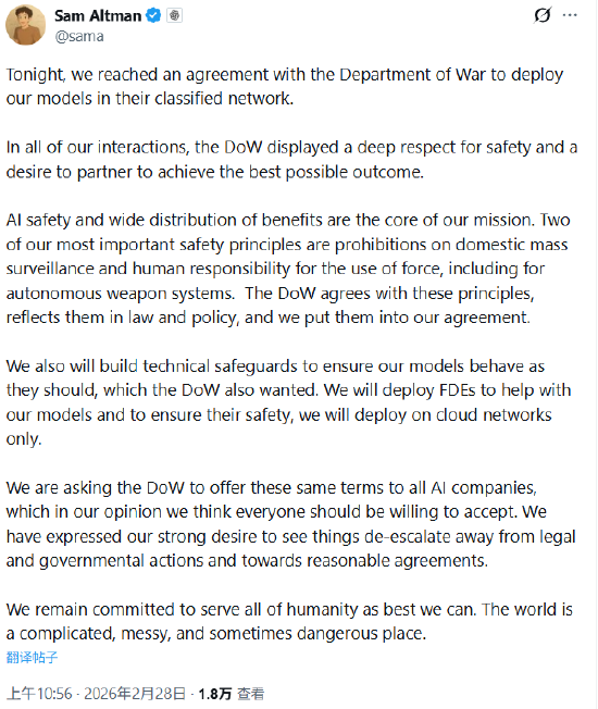 OpenAI创始人奥特曼在社媒发文称,今晚,OpenAI与“战争部”(美国防部)达成协议,将在其机密网络中部署OpenAI的模型。