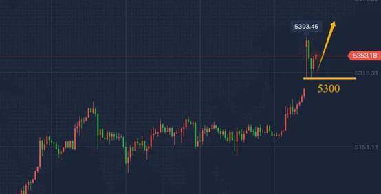 废话就不多说了,直入正题,技术面上周五尾盘强势收尾,加之消息面中东危机爆发,黄金高开高走,一度接近5400关口回落,目前二次试探5300关口支撑点,正如我周末晚间所说的,开盘直接多看涨一波,然后关注早盘低点及日内相对高点,目前黄金回落之后关注5300支撑,以早盘低点作为日内低点来看,目前黄金回撤之后依托早盘低点去布局多,围绕5300整数关口去积极看涨,站稳5400一带再去直接继续去跟进多。