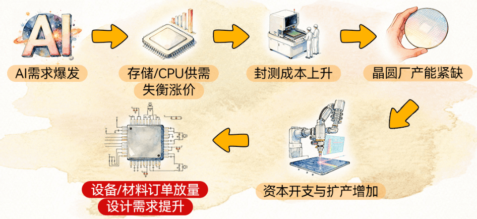 根据银河证券,AI正驱动新一轮半导体周期上行,叠加上游原材料铜、金价格持续上涨,引发“半导体通胀”,存储价格短期快速上涨,相关公司业绩迎来改善。