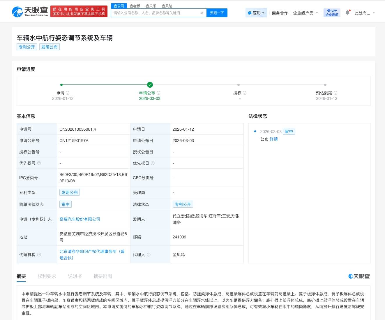 天眼查知识产权信息显示,近日,奇瑞汽车股份有限公司申请的“车辆水中航行姿态调节系统及车辆”专利公布。