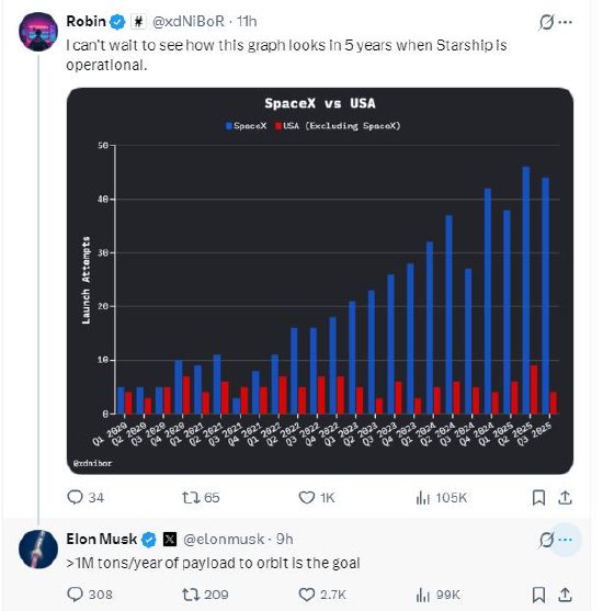 马斯克回应称:“目标是每年将100万吨有效载荷送入轨道。”