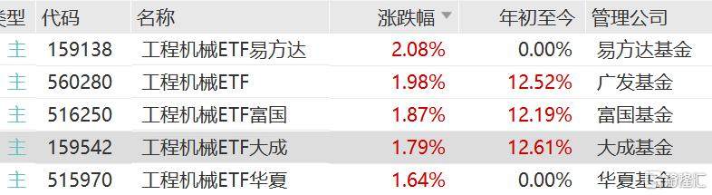 潍柴动力涨超5%,工程机械ETF易方达涨超2%,工程机械ETF大成、工程机械ETF富国、工程机械ETF华夏、工程机械ETF上涨